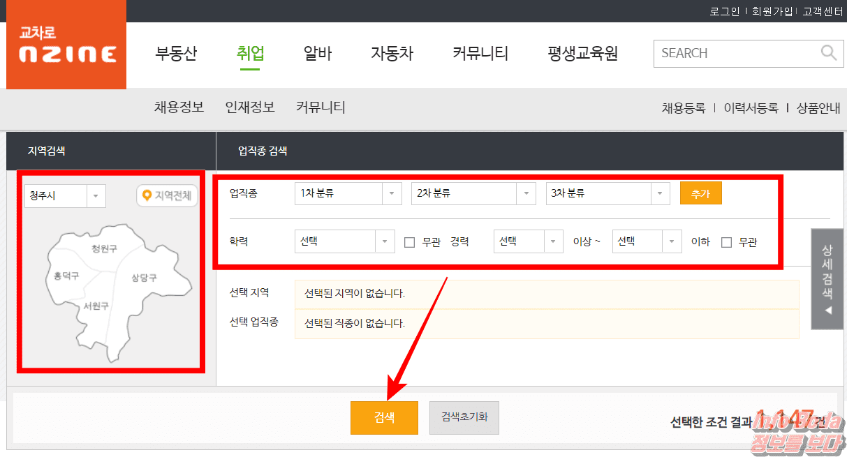 웹사이트에서는 부동산, 취업, 알바, 자동차, 커뮤니티 등이 있는데요. 많은 사람이 관심 있는 분야라면 단연 취업 또는 알바로 청주교차로컴씨는 청주시 지역 내 구인·구직이 쉽게 이루어지도록 업종, 학력 등 정보를 입력해 원하는 회사를 찾을 수 있게 검색 지원 및 각종 회사의 정보를 잘 정리해 놓았습니다.