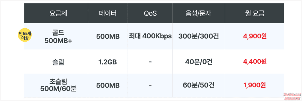 - 골드 500MB+ 만 65세 이상 : 데이터 500MB, QoS 최대 400Kbps, 음성/문자 300분/300건, 월 4,900원
