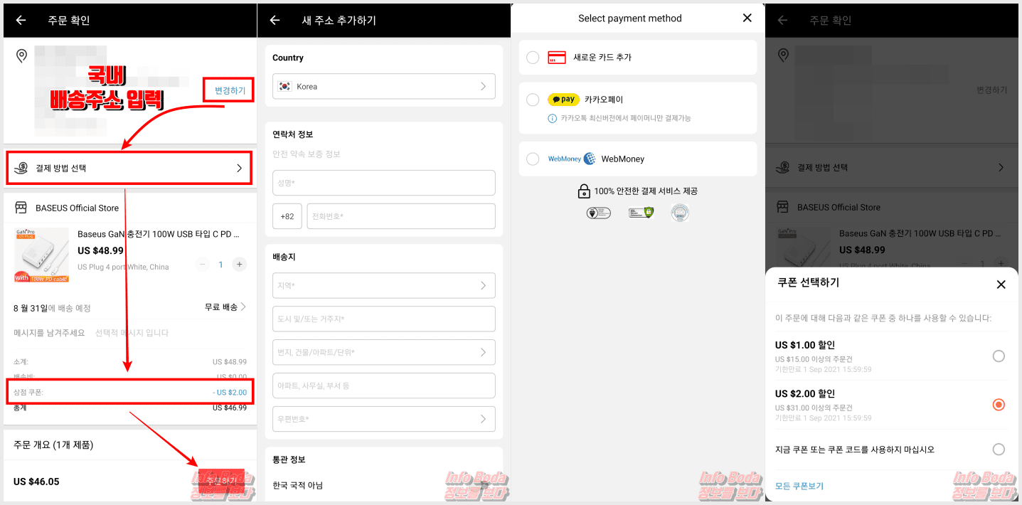 제품을 받을 주소지를 배송주소 입력 방법과 개인통관고유번호 발급하기를 참고하여 작성하고 결제 방법을 선택한다.