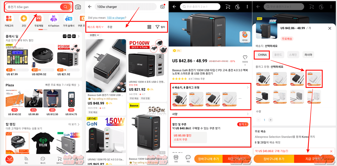 상품 상세페이지에서 스토어 할인 및 쿠폰이 있다면 받기를 눌러 먼저 다운받은 후 배송지와 옵션이 포함된 제품 사진을 누른다. 전자제품의 경우 US 코드, EU 코드, KR 코드 3가지 플러그로 구분되는데, 한국형 KR 코드가 없는 경우 US 코드를 선택해서 돼지코를 끼우면 사용할 수 있다.
