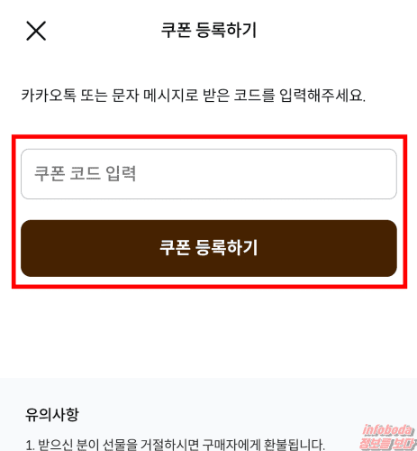 4. 기프티콘(모바일 쿠폰)에 적힌 12자리 숫자를 입력하고 쿠폰 등록하기를 클릭합니다.