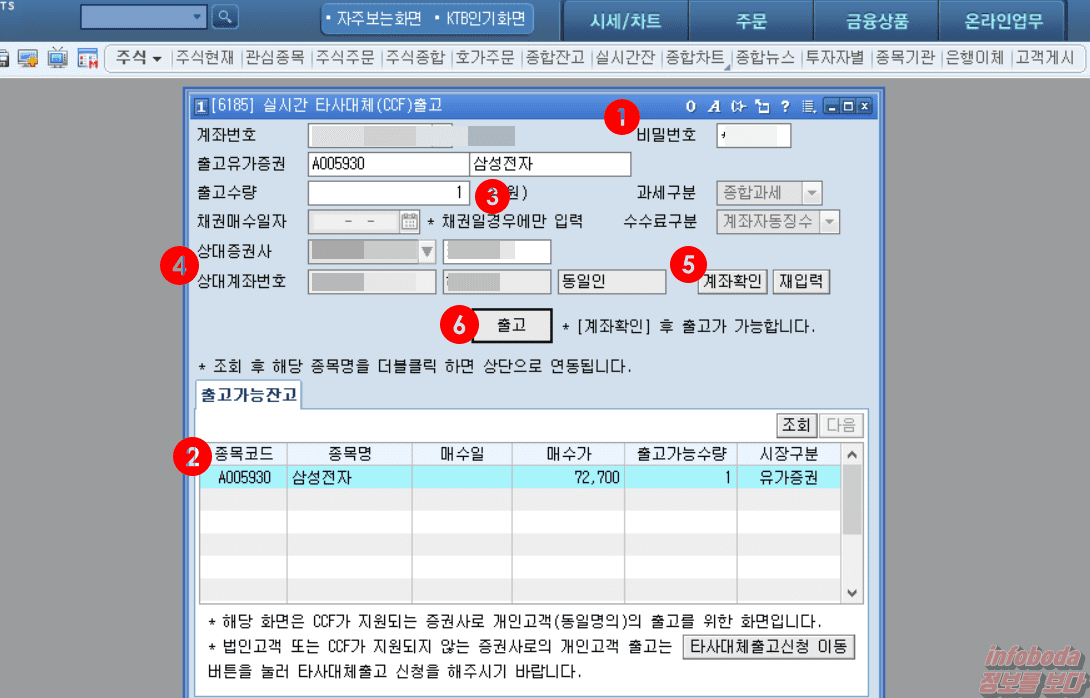 6) 출고할 주식을 누르고 상대증권사와 상대계좌번호 입력 후 계좌확인을 합니다.