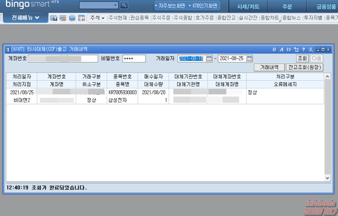 5) 비밀번호를 넣고 조회를 누르면 출고가능잔고가 표시됩니다.