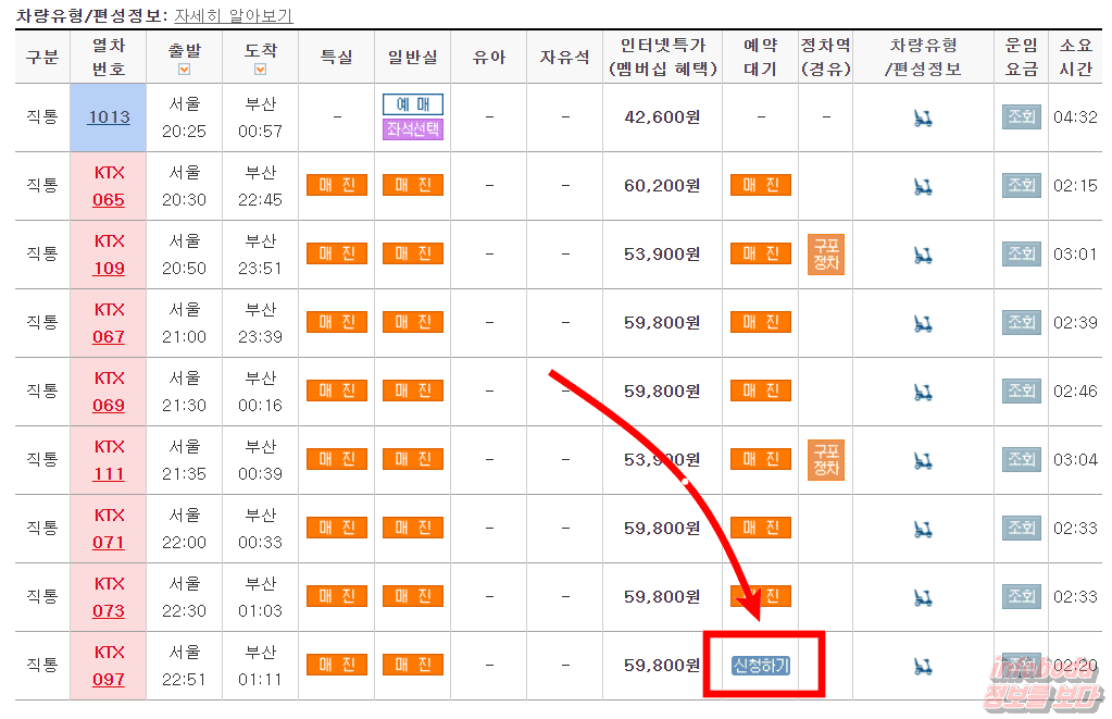 2) 기차 시간을 검색 후 예약 대기 열에서 신청하기 활성화된 곳을 선택합니다.