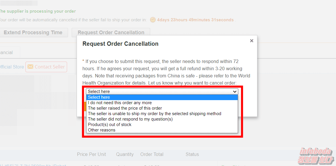 주문 취소 시 상품 준비단계라면 오더 취소 요청을 할 수 있지만, 판매자가 무조건 응하지는 않습니다. 그래서 판매자가 취소 요청을 받지 않고 발송단계로 넘어가는 경우 취소가 불가능해 곤란한 일이 발생하기도 합니다.