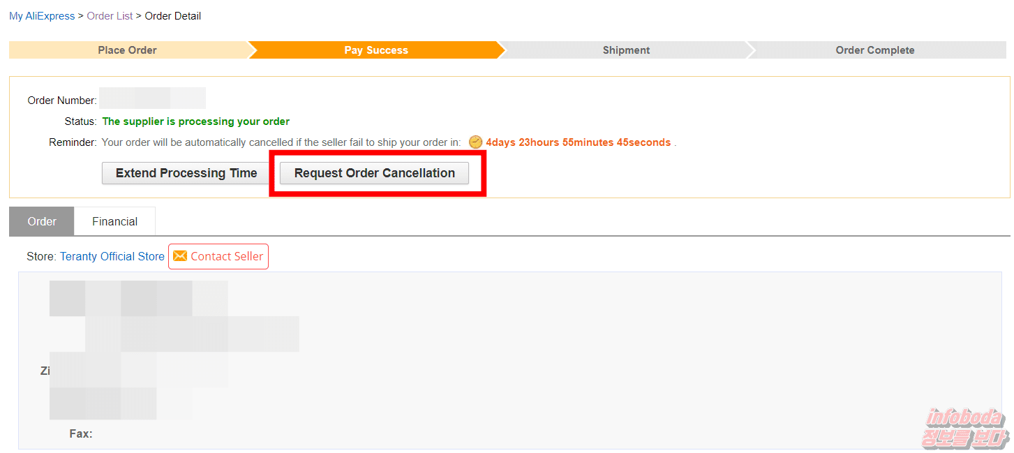 2. 주문 상세에서 Financial 탭을 선택하면 환불 진행 상황을 확인 할 수 있으며, 주문 취소 시 영업일 기준 7일 이내에 환급이 됩니다.