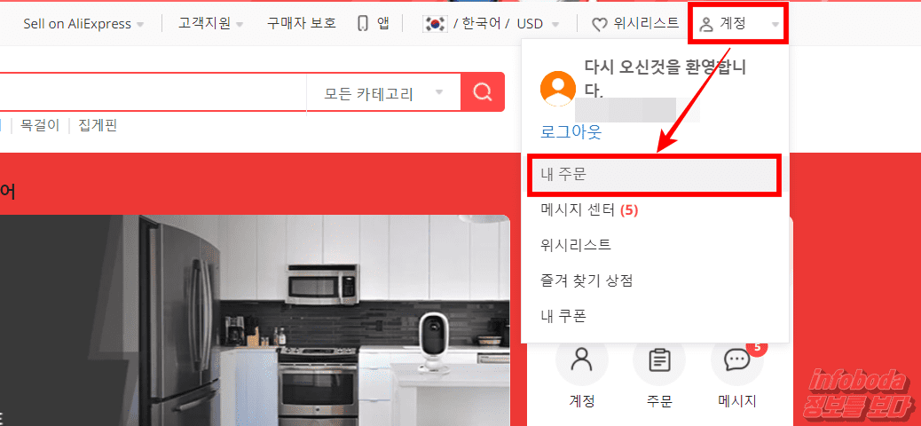 2. 계정을 눌러 내 주문(My Order) 항목을 눌러 주문조회로 이동합니다.
